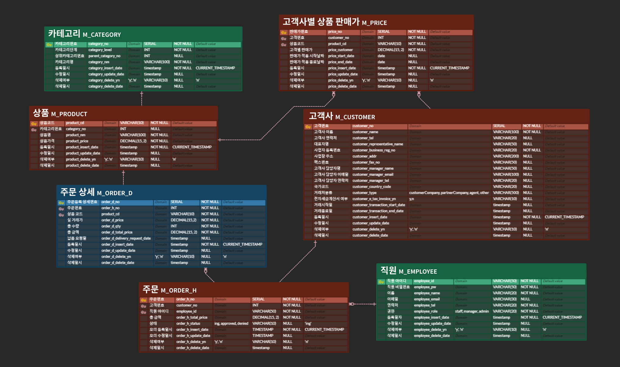- 삭제는 delete_yn 칼럼을 이용해 디폴트값을 ‘N’으로 설정하며, 삭제 시 ‘Y’로 변경하여 기업 요구 사항 반영
