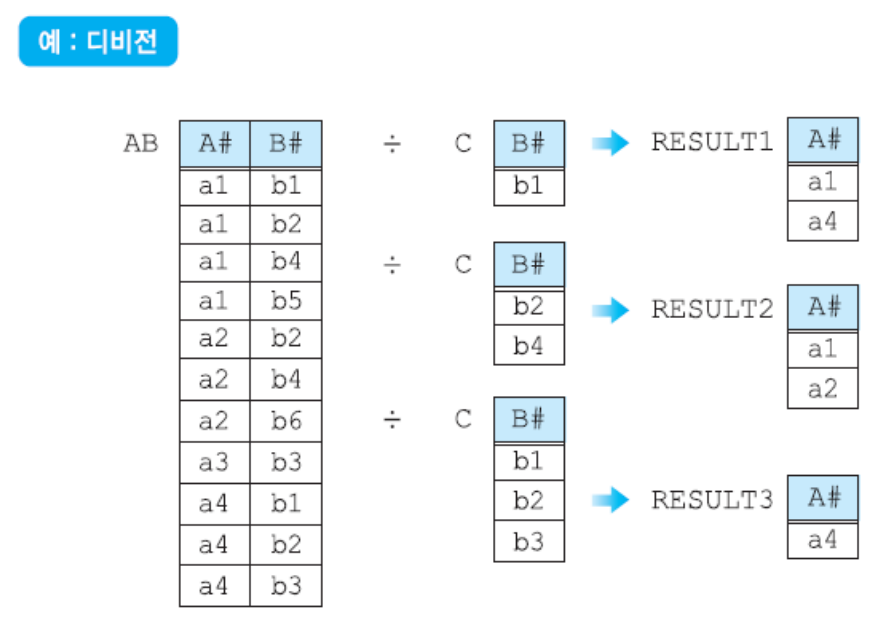 - X ⊃ Y인 R(X)와 S(Y)가 있을 때, R의 속성이 S의 속성값을 모두 가진 튜플에서 S가 가진 속성을 제외한 속성만을 구하는 연산