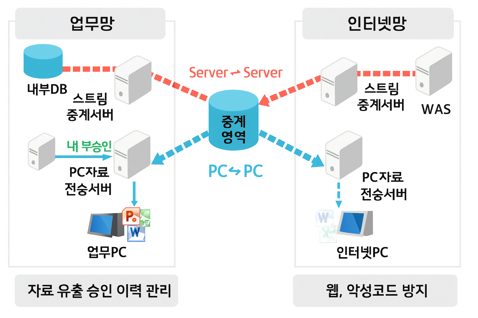 - 서로 다른 망 간의 통신을 직접 열지 않고, 반드시 망연계 서버를 통해 요청을 전달