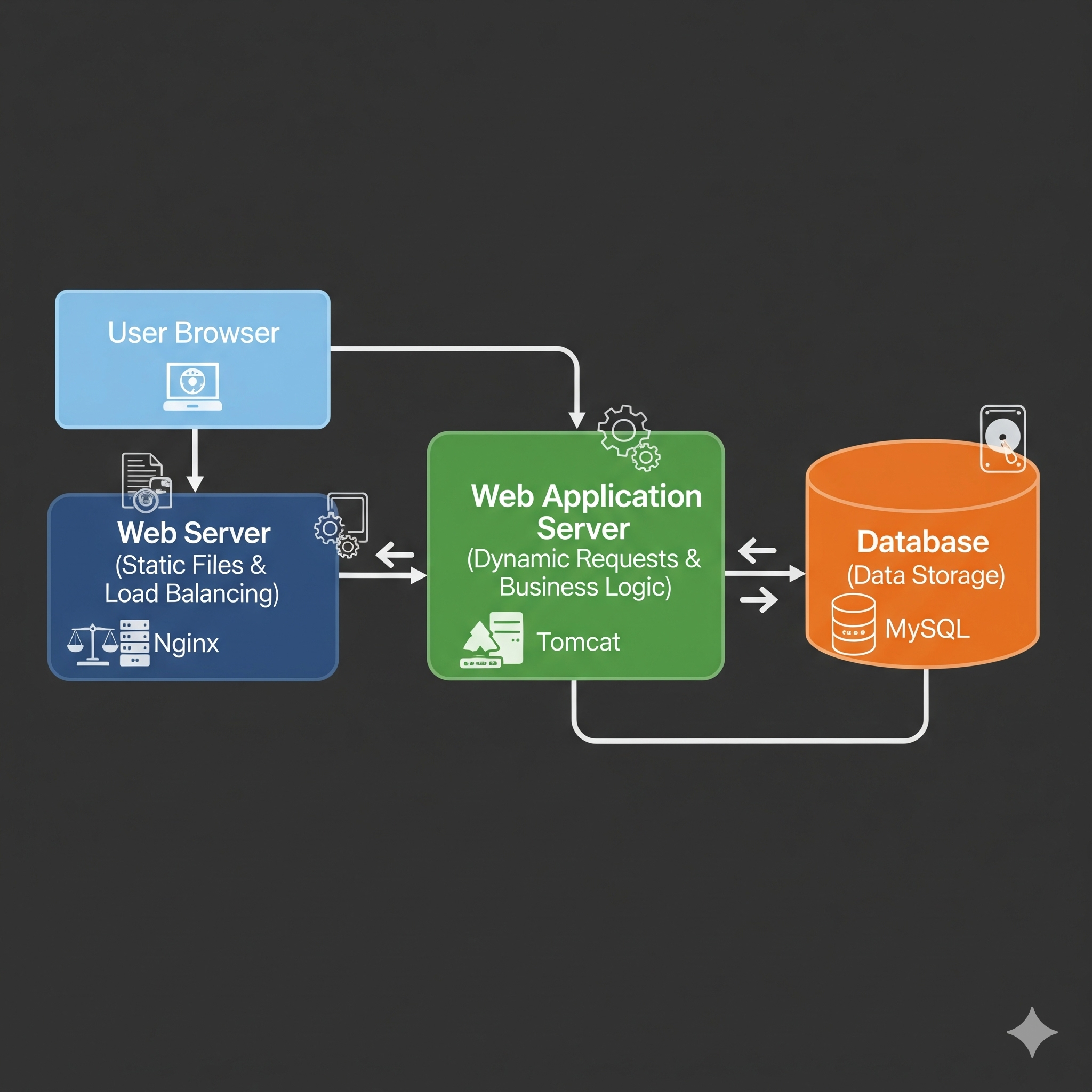 - WAS(Tomcat) = 비즈니스 로직 실행, DB 연동, 동적 페이지 생성
